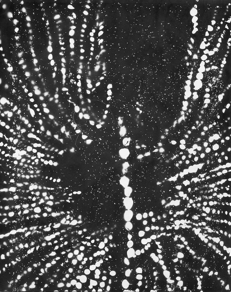 In the Third Street window, Dunn continues this dialogue between the intimate and the surrounding environment. A sequence of photograms created in darkrooms in both California and Buenos Aires reflects her experience of migration across hemispheres, languages, and cultures. For Dunn, the darkroom is not merely a technical space but also a psychic one: a site where memory emerges as a latent image, surfacing through layers of time and matter.