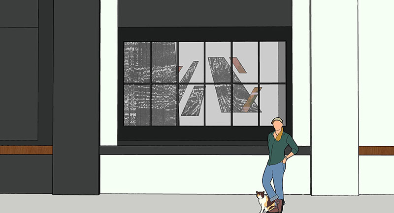 In the Harrison Street window, the artist presents large-scale photograms printed on vinyl and fabric, their surfaces carved and marked to evoke constellations. The image intertwines macro-photographic traces of soil, tree bark, and moss with painted gestures and impressions of the artist’s own body—hair, saliva, fingerprints—entangling the micro and macro cosmos. Red photographic fragments punctuate these images like portals of memory, hovering over the black photogram. These works capture personal traces—memories embedded in photographs, vegetal fragments—alongside the material residues of place.